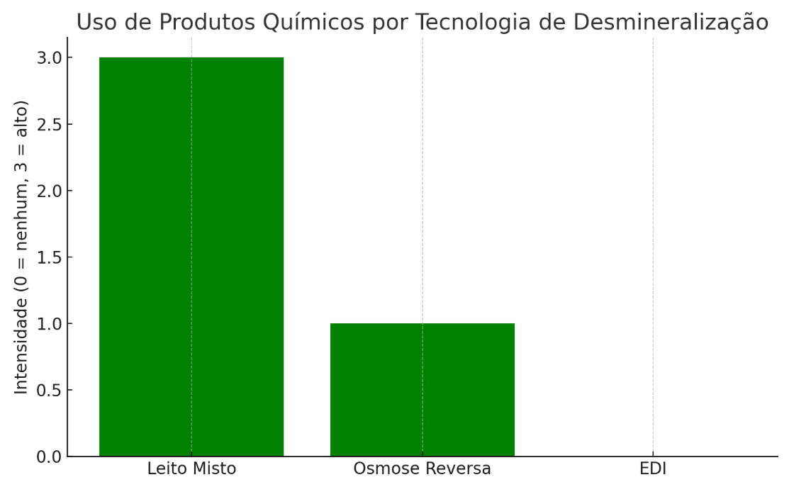 Escala qualitativa representando o nível de uso de químicos por tecnologia. O EDI elimina completamente a necessidade de regenerantes.