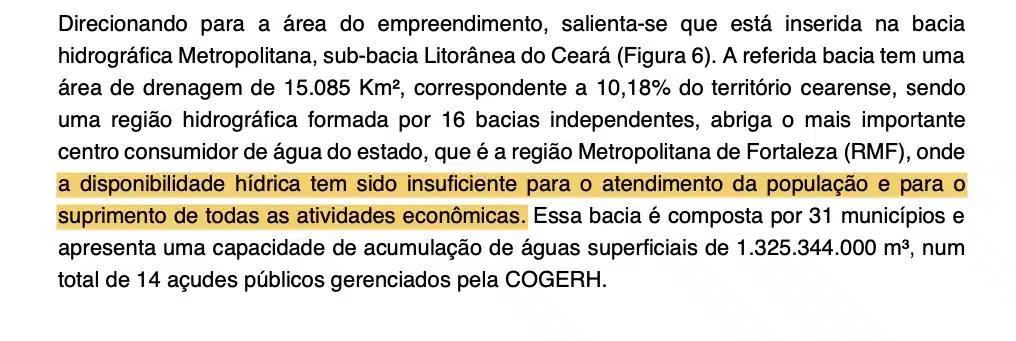 A própria Casa dos Ventos reconheceu, no relatório ambiental simplificado que compõe o licenciamento, que a região hidrográfica onde o empreendimento está localizado tem uma situação hídrica insuficiente.