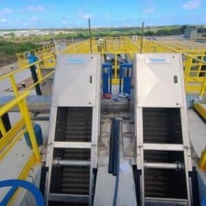 O próprio movimento das placas impede o acúmulo de materiais, mantendo a eficiência de retenção e reduzindo o risco de entupimentos. O equipamento pode operar de forma contínua ou intermitente, ajustando-se automaticamente conforme o nível de efluente detectado por sensores de nível ou por variação de fluxo, o que otimiza o consumo energético e prolonga a vida útil do sistema. Robusta, eficiente e de baixa manutenção, a Step Screen é uma solução moderna e confiável para a remoção de sólidos finos, garantindo maior segurança operacional e desempenho superior no tratamento preliminar de efluentes.