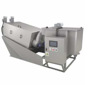 O lodo floculado é alimentado no cilindro, onde o helicoide em baixa rotação conduz pelas zonas de espessamento e desidratação.